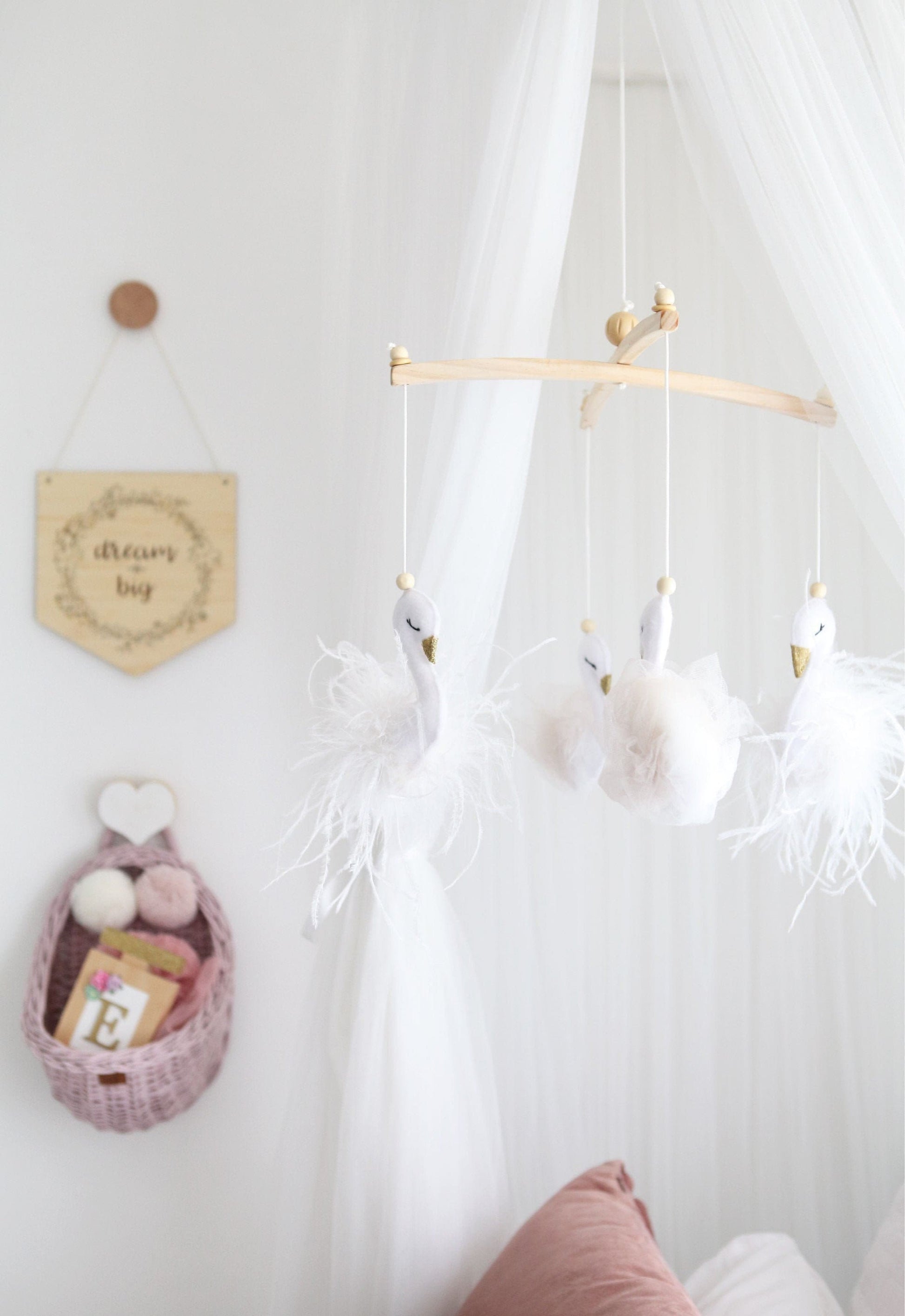 Create a calming and wonder filled space for your little one with our elegant white tulle & feathers swan mobile.
