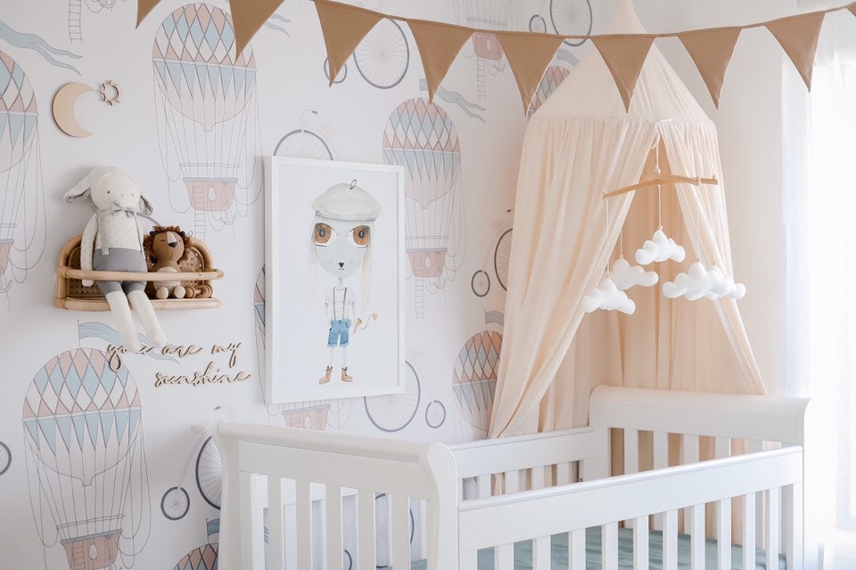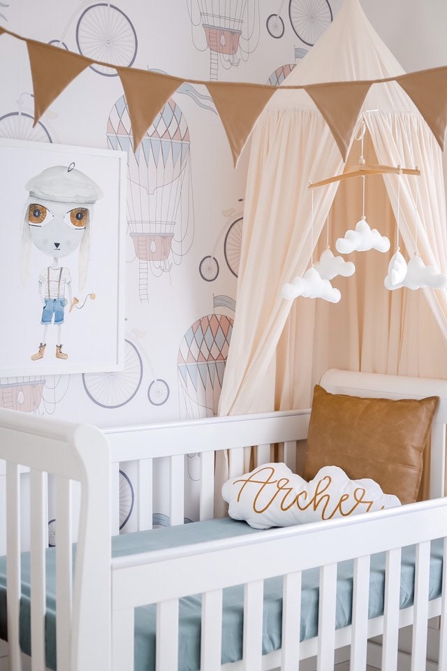 Featuring five fluffy clouds in a beautiful soft white felt, hanging from a natural timber frame. Option to add a first name in beautiful gold writing on the center cloud.