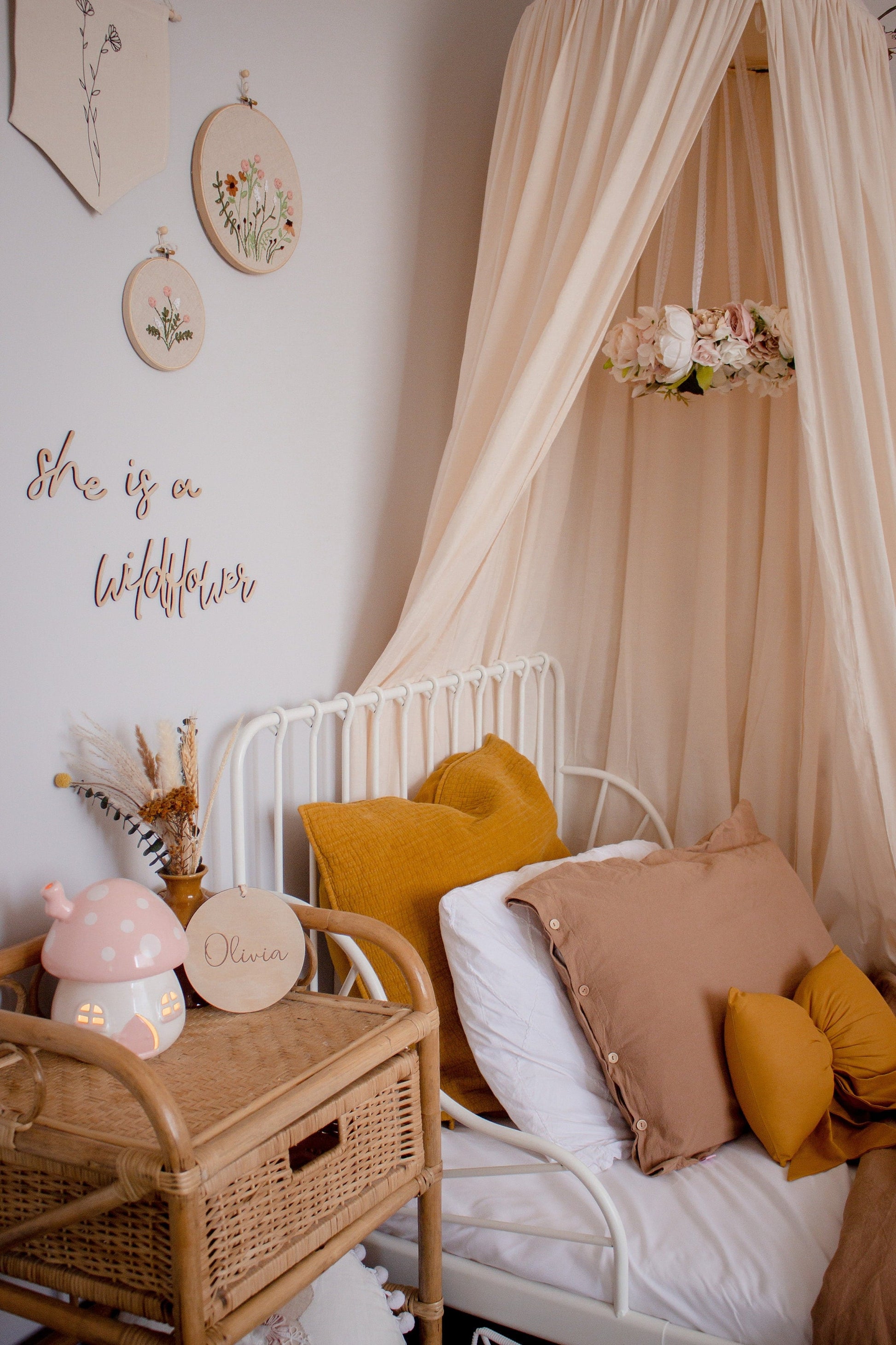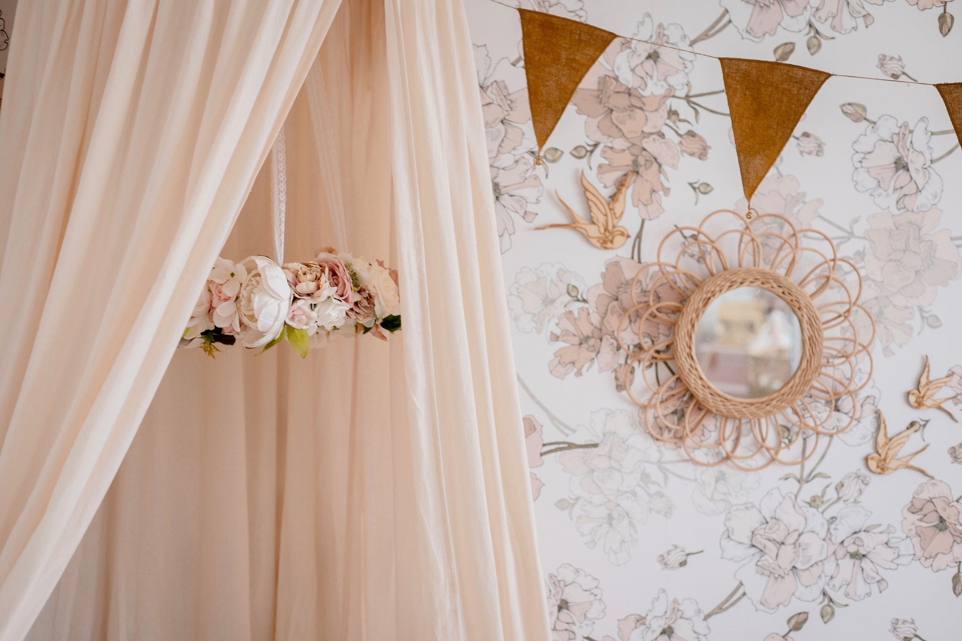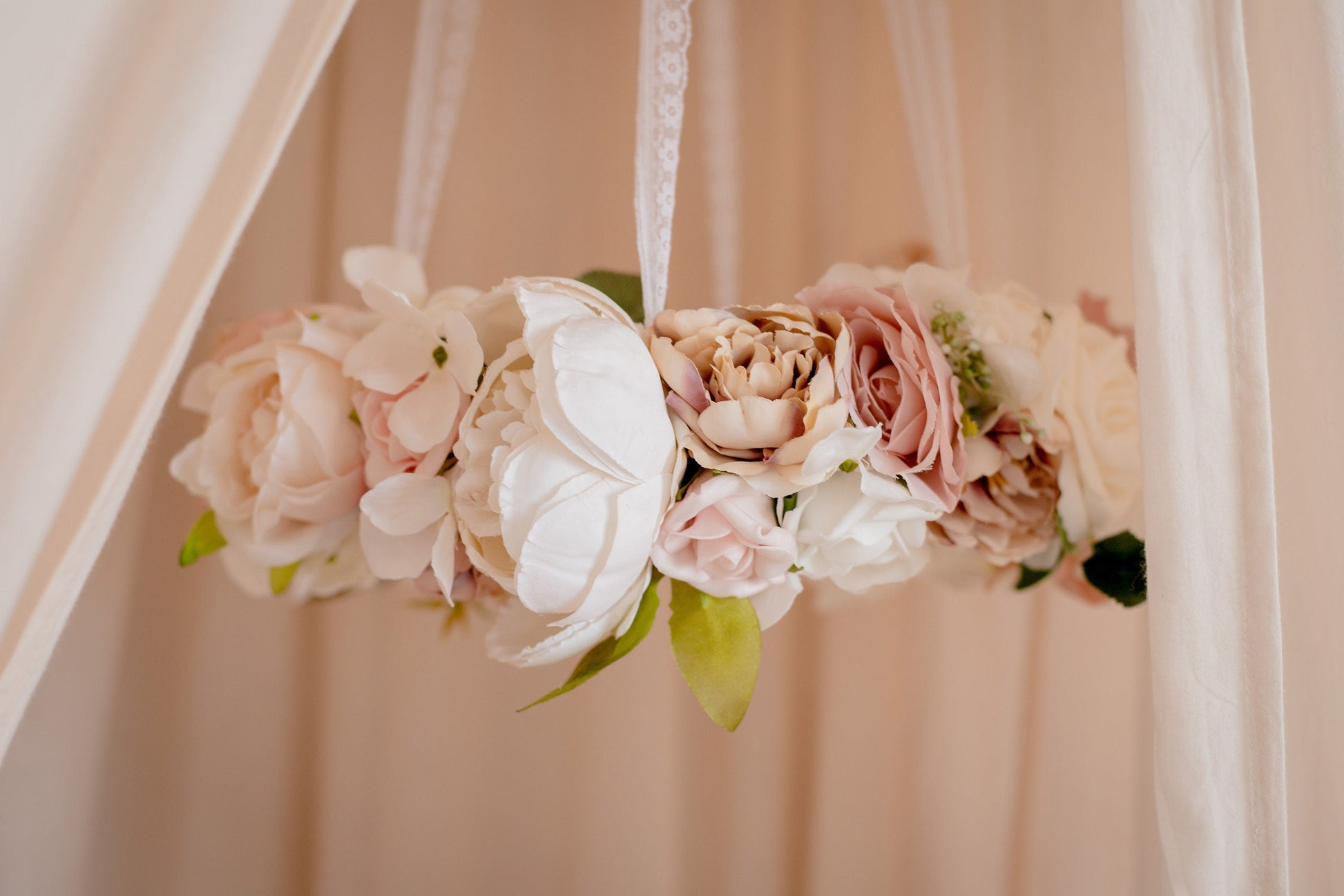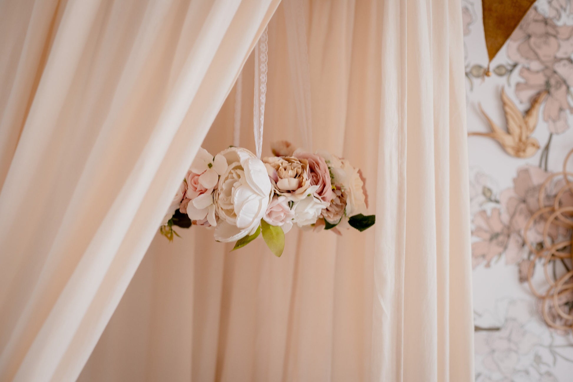 The mobile hangs from delicate lace and is approximately 30-35cm in diameter with flowers. The lace from which it hangs is approximately 60cm.