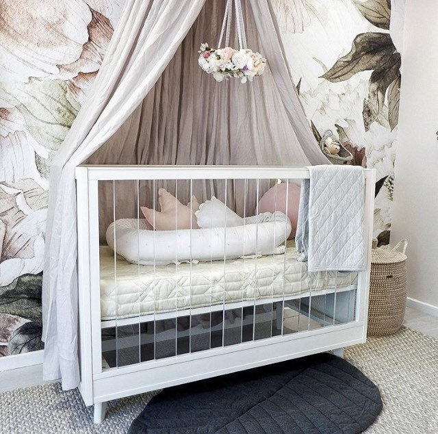 The mobile hangs from delicate lace and is approximately 30-35cm in diameter with flowers. The lace from which it hangs is approximately 60cm.
